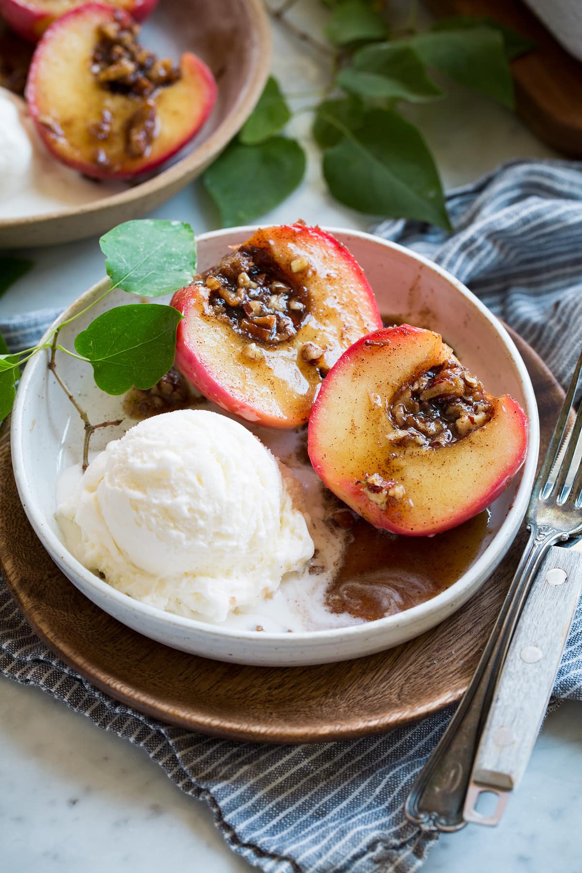 Подавать запеченные яблоки лучше всего с ванильным мороженым, разрезав фрукты на половинки или порезав их дольками.