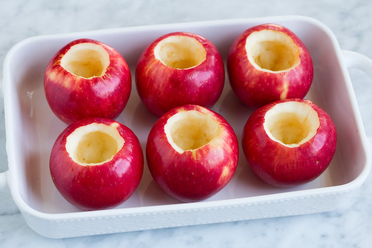 Принцип запекания простой: яблоки нужно подготовить – острым ножом вырезать сердцевину, но оставить при этом «дно», чтобы начинка готовилась как в кармане.