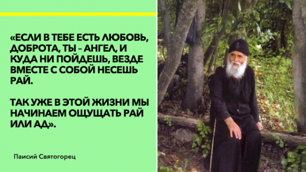 Паисий Святогорец также рассказывает, что человек, уподобившийся своему ангелу-хранителю, который начинает творить исключительно добрые дела, распространяя вокруг любовь, фактически создает рай вокруг себя. То есть рай можно создать уже в этой жизни.