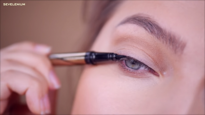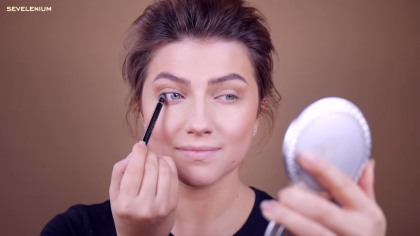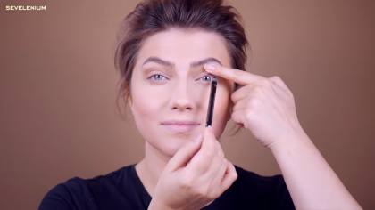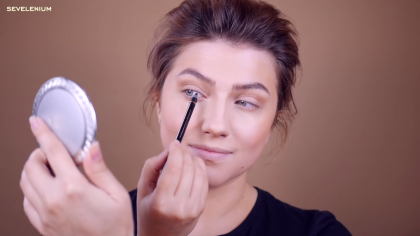 «Возьмите небольшое зеркало и отведите его от себя чуть вправо. Глядя в отражение, прокрасьте левую половину межресничной линии, а затем подвиньте зеркало влево и повторите то же самое на правой части межреснички», — объясняет блогер.