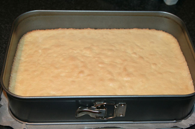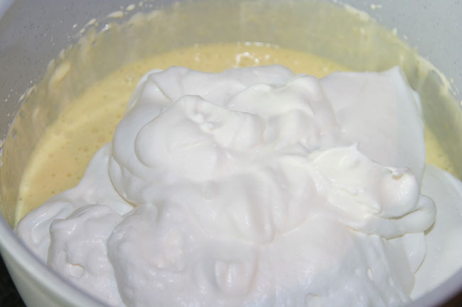 1. Тесто: сильно взбиваем белки, добавляем сахар, затем по одному желтки, масло и, под конец, муку, смешанную с разрыхлителем. Выливаем смесь в прямоугольную форму (35*23 см) или круглую форму (28 см), смазанную небольшим количеством масла и застеленную бумагой для выпечки. Отправляем в духовку.