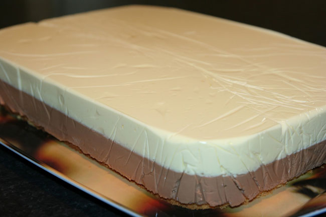 6. Коричневый крем нужно вылить на охлажденный белый крем, чтобы слои не смешивались.