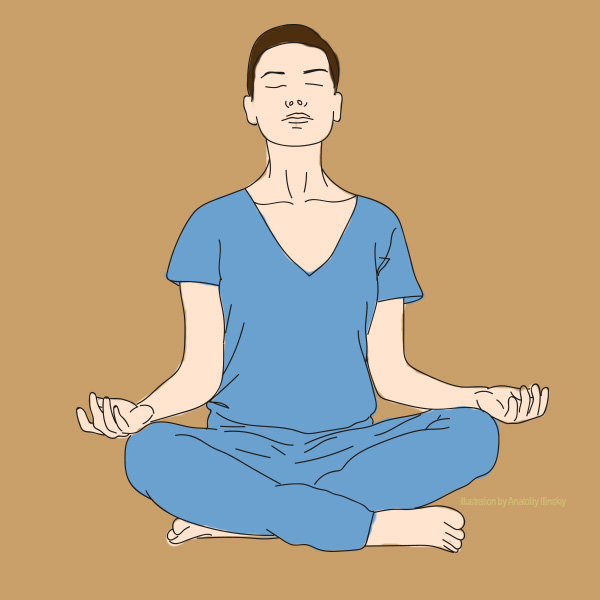 Сядь, скрестив ноги, почувствуй, как расслабляется и удлиняется позвоночник. Можешь слегка потянуться вверх, опираясь на скрещенные ноги. Посиди в этой позе пару минут, дыши как можно глубже и ровнее. Это поможет настроиться на эффективную зарядку и понизить уровень стресса.