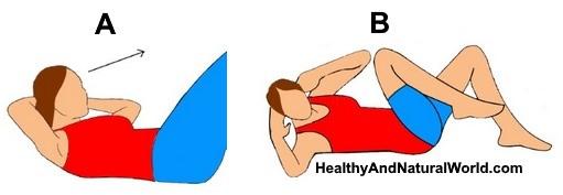 Чтобы проработать верхнюю часть живота, лягте на пол и заведите руки за уши. Согните ноги в коленях, держа ступни на полу. Поднимите плечи и верхнюю часть спины от пола. Выдохните, поднявшись в конечную точку, задержитесь в ней на секунду, вдохните и вернитесь в ИП. Повторяйте 15-25 раз.