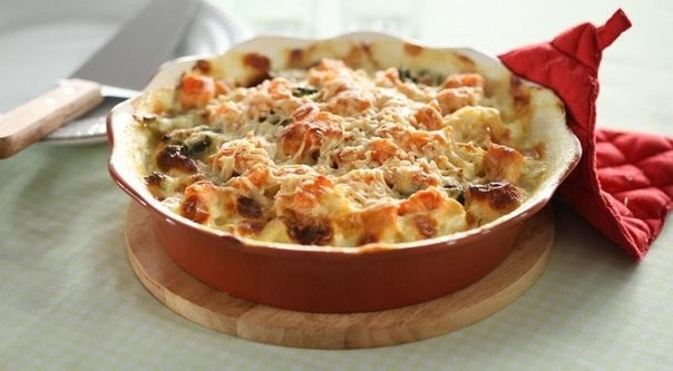 - Всё смешать вместе с яйцом, посолить и выложить в противень. Сверху выложить капусту и посыпать натёртым сыром.