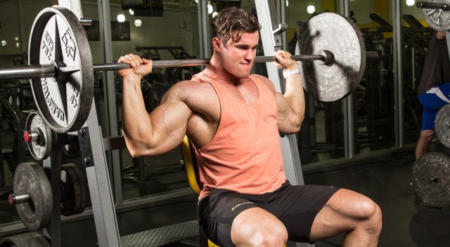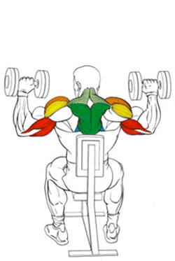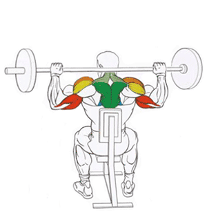 Базовое упражнение, которое полностью направлено на накачивание мышц плечевого пояса. В отличие от предыдущего, выполняется из положения сидя.