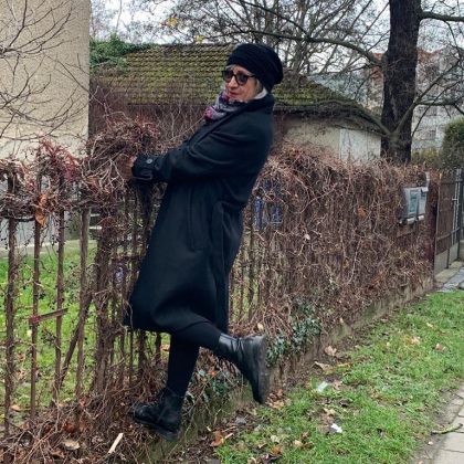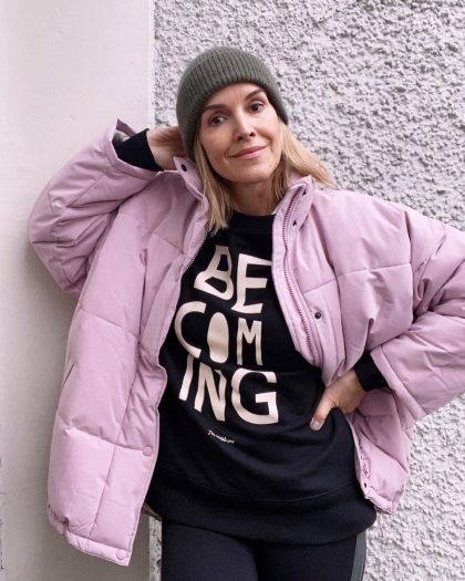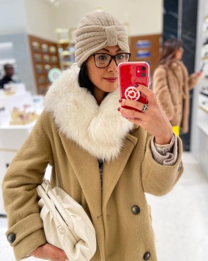 Взгляните на образы зрелой инста-модницы Изабель. Однотонные бини с отворотами ей очень к лицу. В шапке серого оттенка и нежно-розовой куртке женщина выглядит молодо и свежо. Второй вариант — не менее выигрышный. На фоне черного наряда шапка-бини приглушенно-розового оттенка и принтованный шарф смотрятся ярко и эффектно. Этот акцент в образе делает даму еще более женственной и элегантной.