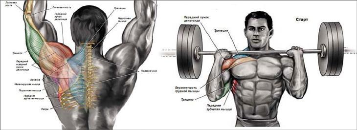 Закидывая штангу на плечи, вы включаете в работу дельты и мышцы рук. Из трех пучков наших дельт больше всего работают передний и средний. Из грудных — их верхняя часть. А из мышц рук – трицепсы.