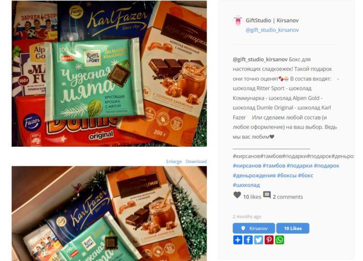 Цена бокса зависела от его наполнения. Мы делали упор на бюджетные варианты боксов (300-500 рублей), состоящие только из сладостей.