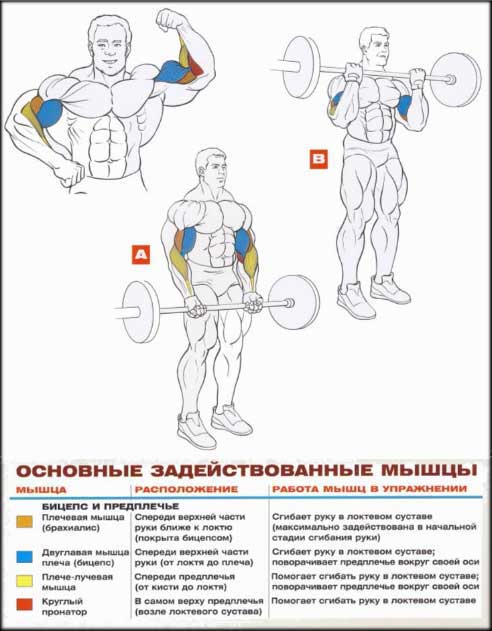 Это основное упражнение для тренировки бицепсов, способное реально нарастить его массу и увеличить силу. Нагрузка здесь равномерно падает на оба пучка бицепса, мышцы внутренней поверхности предплечья, и плечевую мышцу.