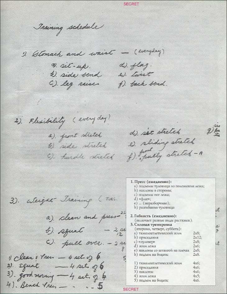 Записи (не полные) за январь 68-го года сообщают, что в месяц состоялось тренировок: на растяжку и отработку ударов – 15, на скорость – 12, на скручивание (в том числе подъем туловища) и подъем ног в висе – 121 и 129, для ног (приседания и другие) 19, бег (в том числе спринт) – 10 часов.