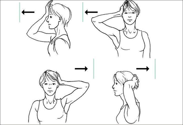 - Наклоны головы в стороны и вперед-назад. Можно разделить движение на две части, а можно объединить в одно упражнение. Перед началом слегка помассируйте шею руками
