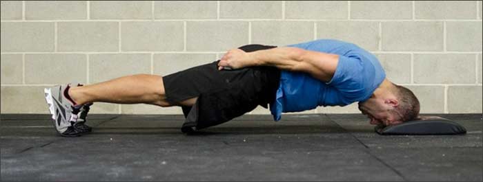 С помощью рук помогите себе занять исходное положение. Голова должна быть слегка запрокинута назад. Заняв нужное положение, уберите руки. Затем начните плавно перекатываться в сторону ног, тем самым увеличивая нагрузку на мышцы разгибатели шеи