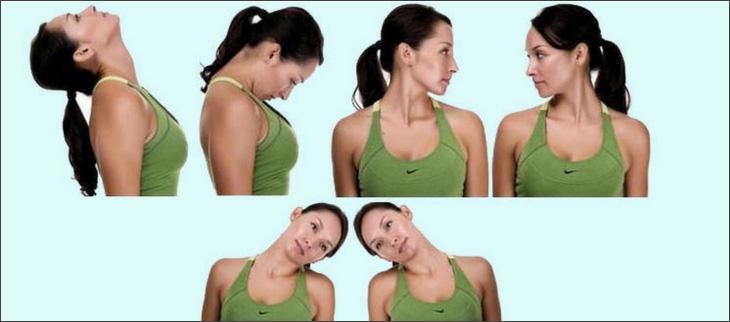 - Наклоны головы в стороны и вперед-назад. Можно разделить движение на две части, а можно объединить в одно упражнение. Перед началом слегка помассируйте шею руками