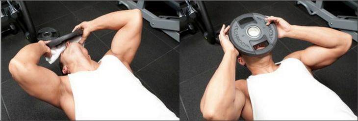 - С диском. Все что вам потребуется это блин номиналом от 5 до 20 кг и полотенце. Лягте на скамью для жима лежа так чтобы голова и шея выходили за границы скамьи. Если вы собираетесь делать упражнение на мышцы, разгибающие или сгибающие голову и шею, то положите диск на затылок или лоб соответственно. При боковых сгибаниях положите блин на область выше уха.