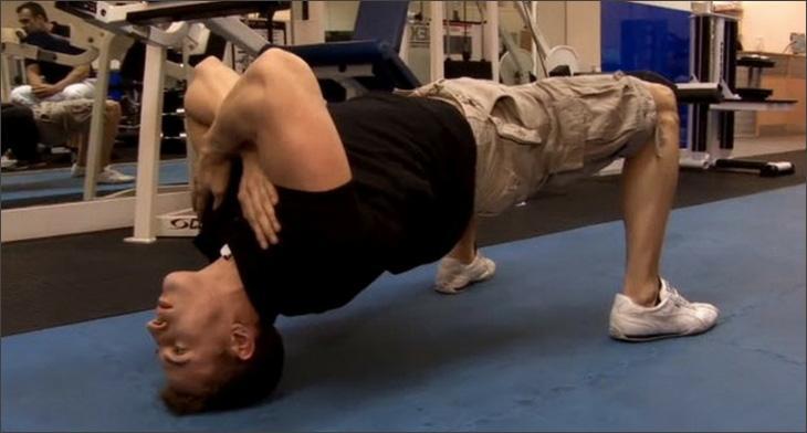 - Обратный борцовский мост. Данным упражнением необходимо дополнять обычный борцовский мост, для сохранения баланса в развитии мышц шеи. Ведь в таком исполнении упражнение тренирует передние шейные мускулы. В силу сложности и травмоопасности упражнений, рекомендую выполнять их только под присмотром опытного тренера.