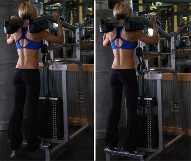 Упражнение для икроножных мышц. Позволит вам как следует нагрузить мышцы за счет возможности использования дополнительного отягощения. В нижней точке амплитуды старайтесь растянуть мышцы. Выполните 3-4 подхода по 12-15 повторений.