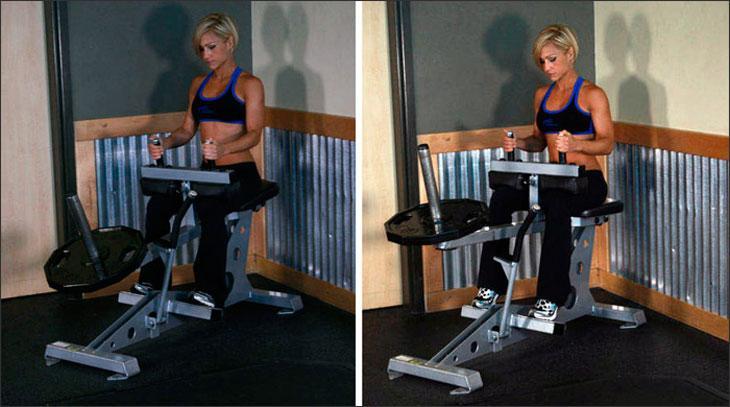 Прицельно нагружает камбаловидные мышцы. Преимущества выполнения этого упражнения с помощью тренажера в том, что он избавит вас от необходимости искать отягощение на колени и подставку под ноги. Выполните 3-4 сета по 12-15 повторений.