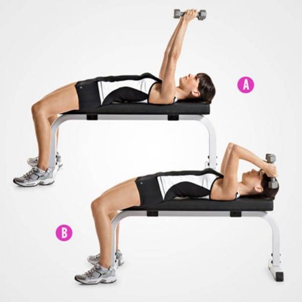 Французский жим лежа. Для выполнения упражнения надо взять 5-6 килограммовую гантель или «блин» от штанги. Следует лечь на гимнастический коврик, ноги согнуть и поставить ступни максимально близко к ягодицам. В руки берем утяжелитель, и начинаем плавно отводить руки вверх до тех пор, пока не коснемся гантелей пола. Медленно возвращаемся в исходное положение. Повторяем упражнение 2-3 сета по 15 раз.