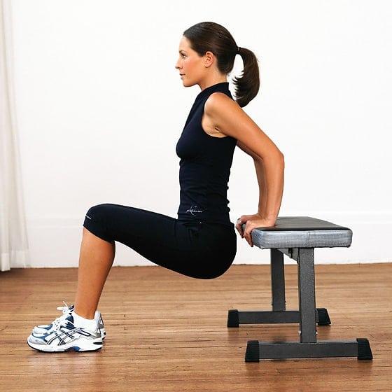 Обратные отжимания выполняются с использованием опоры. Нужно стать к лавке (стулу, полке) спиной и упереться в нее ладонями. Делаем 1-2 шага вперед и начинаем приседать максимально низко. Упор приходится на руки и пятки. Выполняем 2-3 подхода по 10 повторений. Это отличное упражнение для подтяжки отвисшей кожи рук, а именно трицепса.