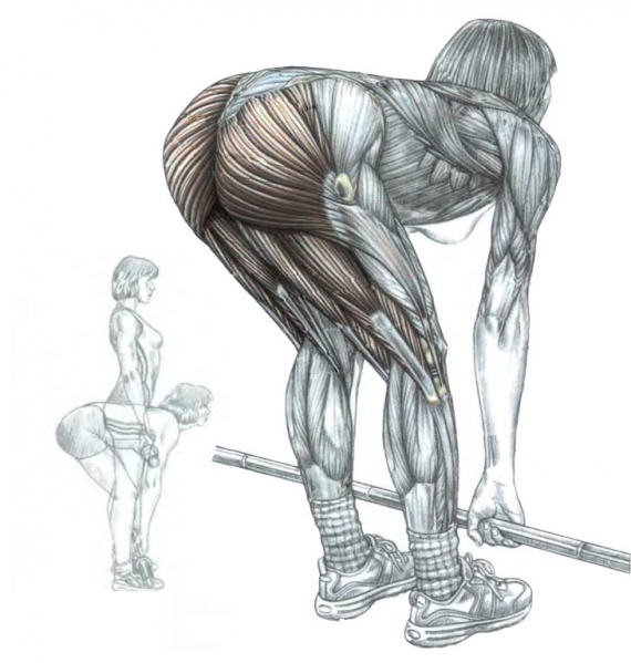 - Есть еще одно хорошее упражнение для задней поверхности бедра и ягодичных мышц — это становая тяга на прямых ногах.