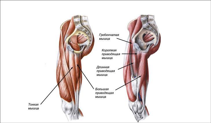 На внутренней поверхности бедра можно выделить 5 мышц, отвечающих за приведение бедра к плоскости симметрии тела (движение внутренней поверхности одного бедра навстречу другому). Это тонкая и гребенчатая мышцы, а также длинная, коротка и большая приводящие.
