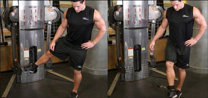 Упражнение выполняется стоя. Для того чтобы его выполнить потребуются петли для ног, которые представляют собой манжету с крючком. За крючок цепляется трос блочного тренажера. Техника выполнения представлена на фото.