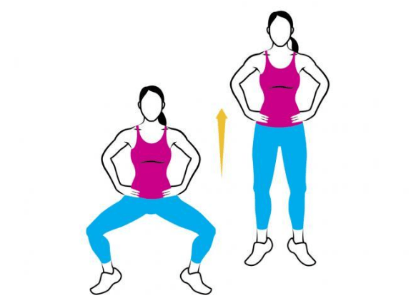 - Выпрыгивания. Можно прыгать без утяжеления или с весом. Присядьте, сделав упор на носочки, и выпрыгивайте максимально вверх. Выполняйте 20-30 прыжков в 2-3 подхода.