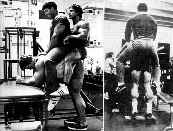 - Упражнение «ослик». Для выполнения потребуется партнер. Станьте носками на возвышенность, руками упритесь в перекладину или тренажер, согнув при этом корпус. Помощник должен сесть на спину атлету. Необходимо подняться на носки максимальное количество раз.