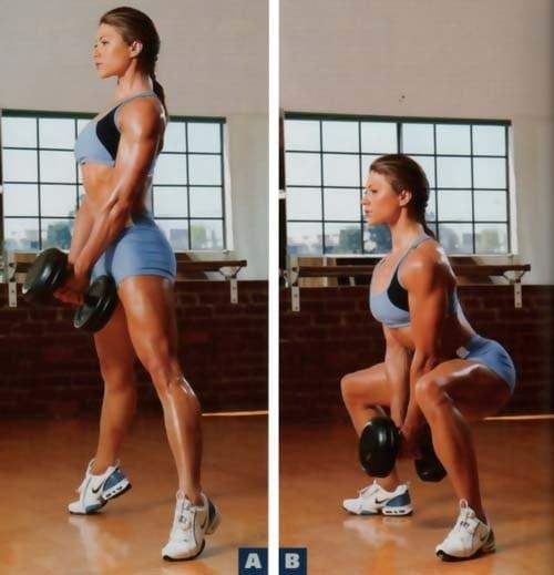 - Приседания на носках. Исходная позиция – стоим прямо, ноги на ширине плеч, в руках гантели. Выполняем приседания до того, как бедра станут параллельны полу, поднимаемся на носки. Спину держим прямо, дышим ровно.