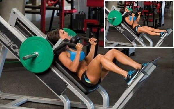 - Жим платформы носками. Необходимо лечь в тренажер, ногами упереться в нижний край платформы, расставив их на ширине плеч. Делаем вдох и на выдохе поднимаем платформу носками. Здесь важен не вес, а амплитуда, поэтому если трудно достичь верхней точки, уменьшите количество блинов.