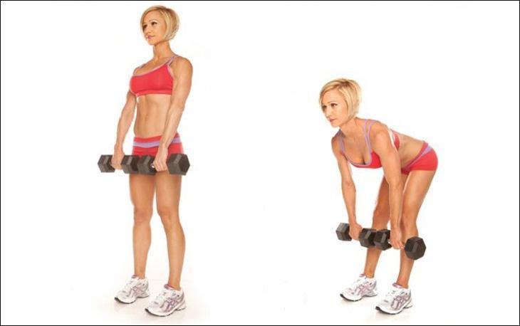 - Наклоны с гантелями в руках (работают разгибатели спины, отвечающие за поясничный отдел позвоночника), важно во время выполнения упражнения не выпячивать живот, а втянуть его и напрячь мышцы пресса – выполните 3-4 подхода по 12-15 повторений
