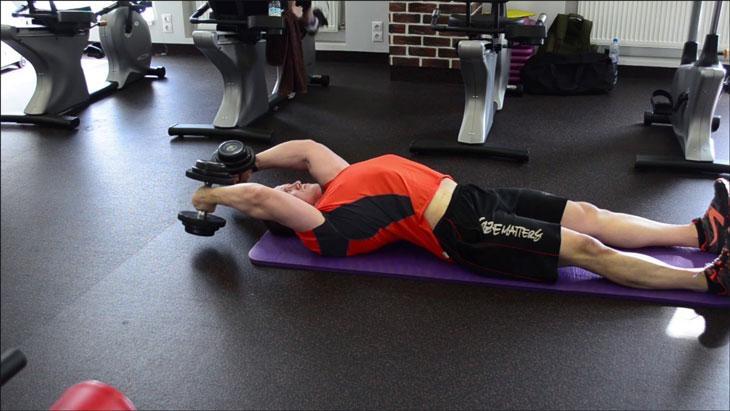 - Пуловер с гантелью лежа на полу (упражнение, которое задействует широкий спектр мышц, в том числе и широчайшие мышцы спины)