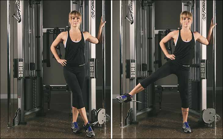 Преимуществом данного упражнения над его домашней версией является возможность добавления отягощения. Как правило, в залах есть специальные лямки на лодыжки, с помощью которых вы можете прикрепить к ноге трос от вертикального блока