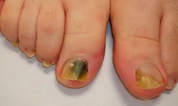 Онихомикоз — широко известный как грибок ногтя — характеризуется воспалением, болью и опуханием пальца ноги, а также пожелтением, утолщением и разрушением самого ногтя. Грибок ногтей может быть результатом аномального рН кожи, постоянного воздействия влаги, ношения синтетических носков, скомпрометированной иммунной системы, накопления пота в обуви, плохой гигиены ног или слабого кровообращения.