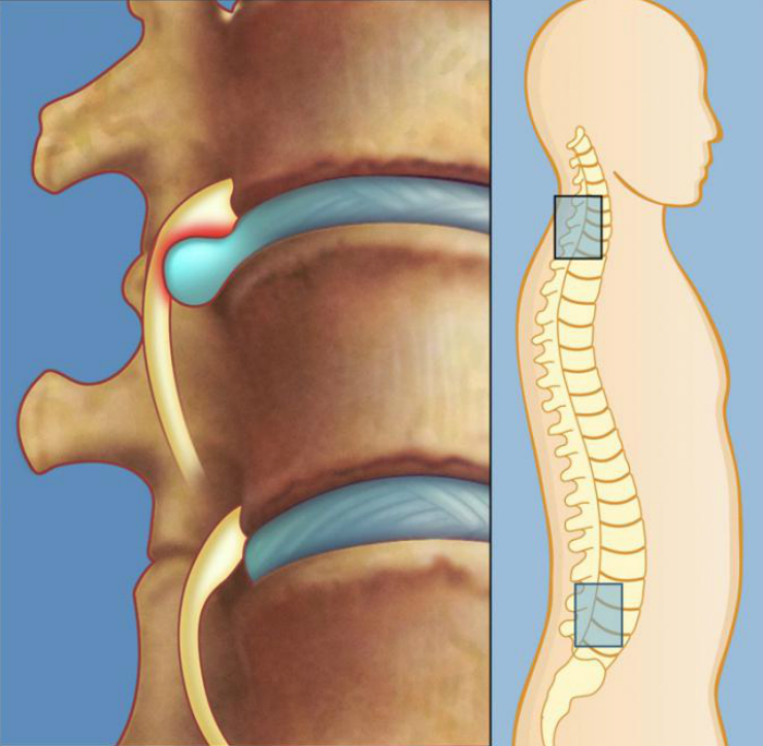 Через разрыв или трещину жидкость из ядра вытекает, защемляя нервные окончания спинного мозга. Сам диск от надавливания позвонков, как воздушный шарик, выпячивается. Так образуется грыжа межпозвоночного диска.
