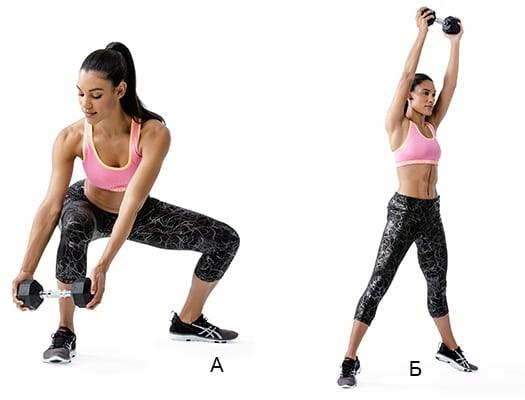 Исходное положение ноги в стороны на ширине плеч, носки врозь. В руках должна быть одна гантель, расположите её перед собой. Сначала присядьте к правой ноге, при этом повернув туловище, гантель должна оказаться у правой стопы (А). Далее вернитесь в начальное положение. Встаньте на носочки и поднимите прямые руки над головой (Б). Снова встаньте в исходную стойку и повторите упражнение к другой ноге. Повторять 10 раз.