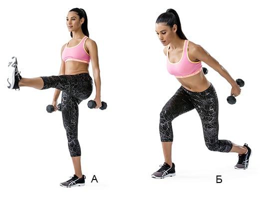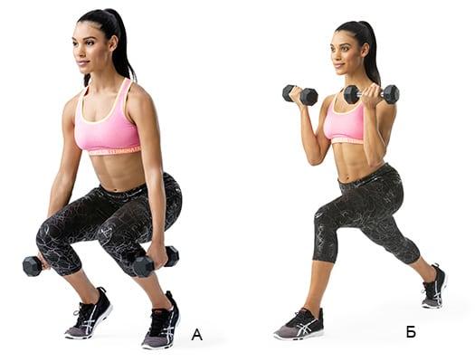 Встаньте прямо, ноги — на ширине плеч. Возьмите в руки гантели и опустите их вдоль тела. Выполните приседание, задержитесь в нижней точке и оторвите пятки от пола (А). Не поднимаясь, опустите пятки и выпрямите правую ногу назад, перейдя в обратный выпад. Согните руки в локтях и притяните гантели к плечам (ладони направьте к себе) (Б). Вернитесь в исходное положение. Повторите упражнение 10 раз и смените ногу.