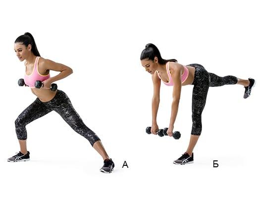 Возьмите пару гантель. Исходное положение прямо, ноги вместе. Сначала сделайте шаг вперед правой ногой, образовав угол в 90 градусов. Затем резко встаньте и сделайте мах левой ногой перед собой (А). Далее левую ногу отведите назад при этом не касаясь пола. Туловище наклоните вперед, а гантели должны располагаться на уровне ребер, руки отведите назад (Б). Снова встаньте в начальное положение. Повторите тоже самое на другую ногу. Всего сделать 10 повторов.