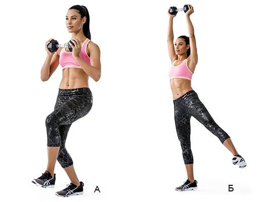 Встаньте прямо, ноги — на ширине плеч. Возьмите одну гантель и удерживайте ее обеими руками перед грудью. Оторвите левую ногу от пола, а правую слегка согните в колене (А). Распрямите правую ногу, подняв согнутую левую на уровень бедра. Выпрямите руки над головой, одновременно выведя левую ногу в сторону (Б). Вернитесь в исходное положение. Сделайте 10 повторений и смените сторону.