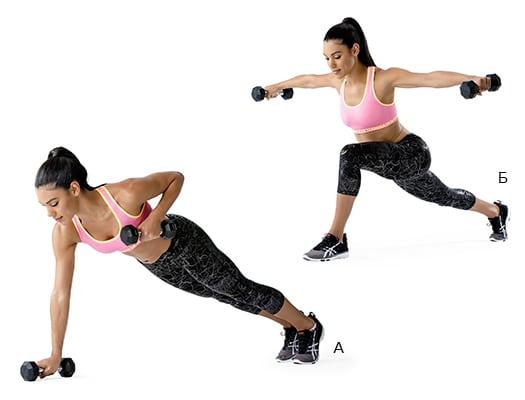 Встаньте в позу планки с опорой на гантели. Подтяните левую руку к ребрам (А). Верните левую руку в исходное положение и подтяните к груди правую. Затем сделайте широкий шаг вперед левой ногой, расположив стопу между кистями и разведя прямые руки в стороны (Б). Вернитесь в исходное положение. Повторите упражнение 10 раз и поменяйте ногу.