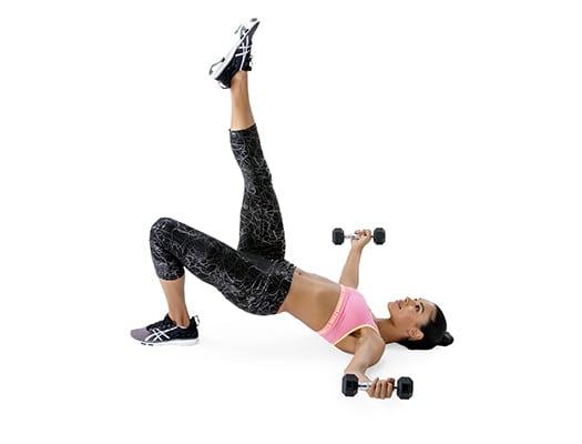 Лягте на спину, ноги согнуты в коленях. Возьмите в руки гантели и удерживайте их перед грудью. Оторвите бедра от пола так, чтобы ваше тело образовало прямую линию от коленей до плеч, выпрямите правую ногу, а руки — вверх (ладони развернуты друг к другу). Разведите руки в стороны (трицепсы параллельны полу, как показано на фото). Вернитесь в исходное положение, повторите упражнение 5 раз и смените ногу.
