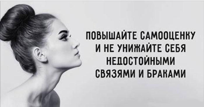 Совет. Нет, это не есть полноценность. Те, кому якобы «не повезло» с мужем или в любви, сами приложили к этому руку. Потому повышайте самооценку и не унижайте себя недостойными связями и браками. Мы должны учиться у мужчин быть смелыми, настойчивыми и уверенными в себе.